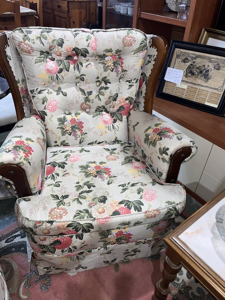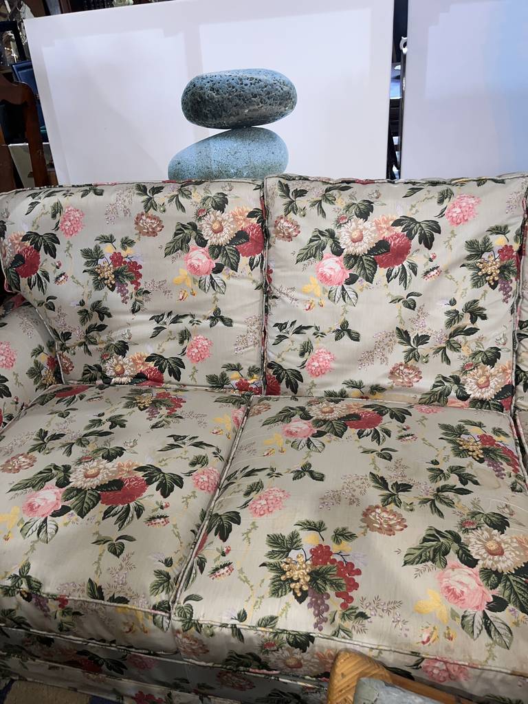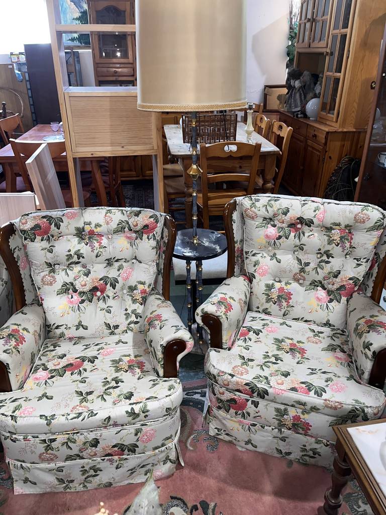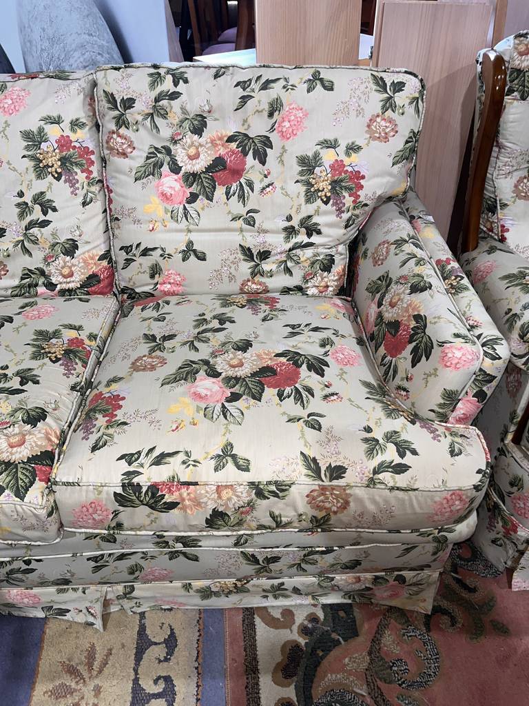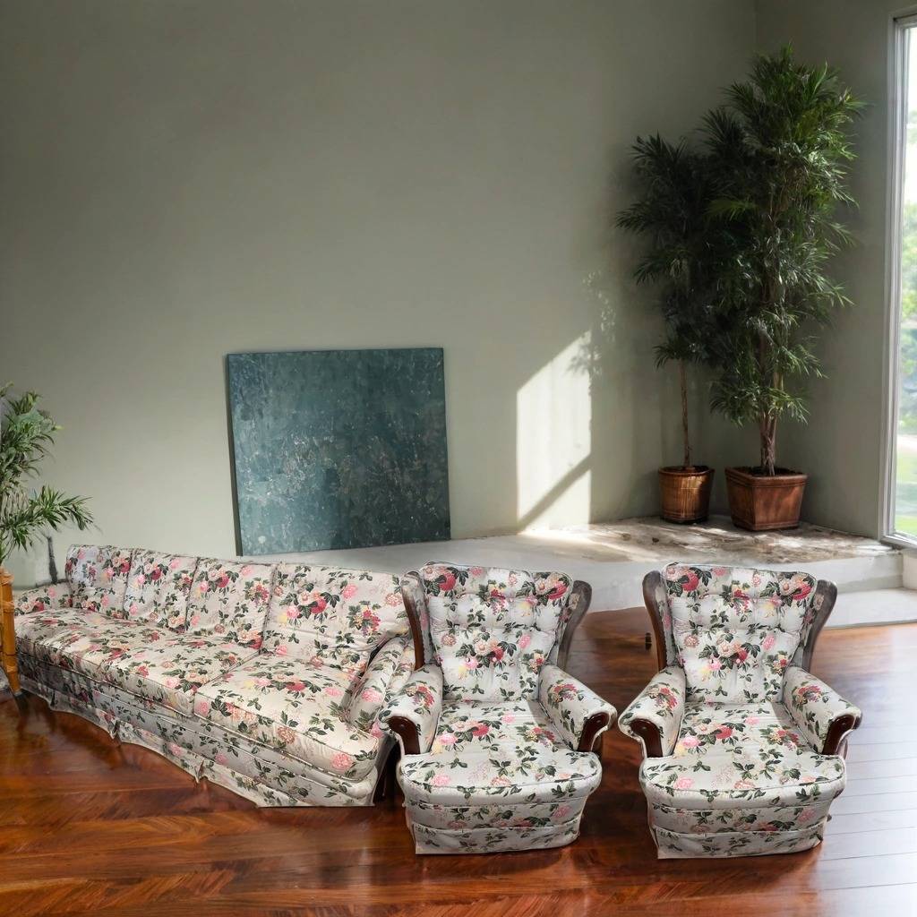 Conjunto formado por un sofá de cuatro plazas y dos sillones con balancín con un bonito estampado de flores de colores con hojas. Se trata de un sofá amplio y espacioso que va acompañado de dos sillones individuales que llevan balancín incorporado para mecerse mientras uno está sentado. Como se puede observar en las fotografías el conjunto se encuentra en buenas condiciones.