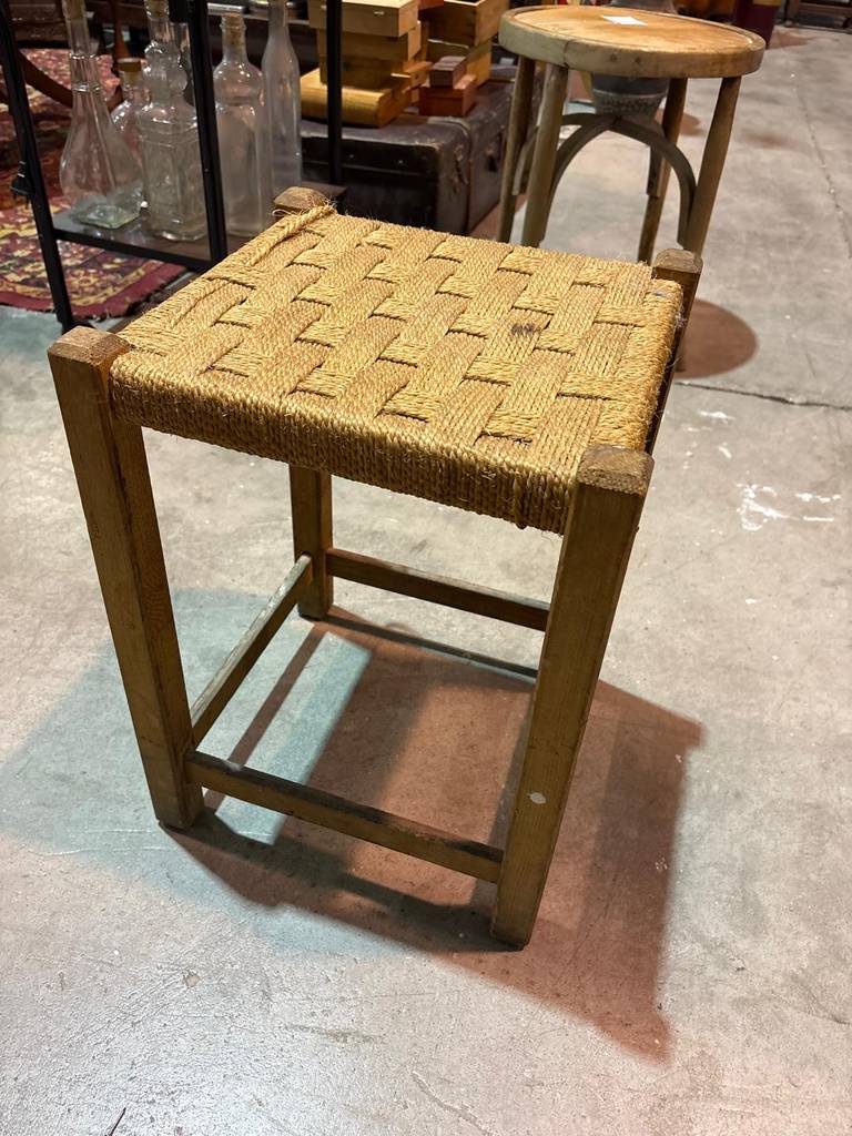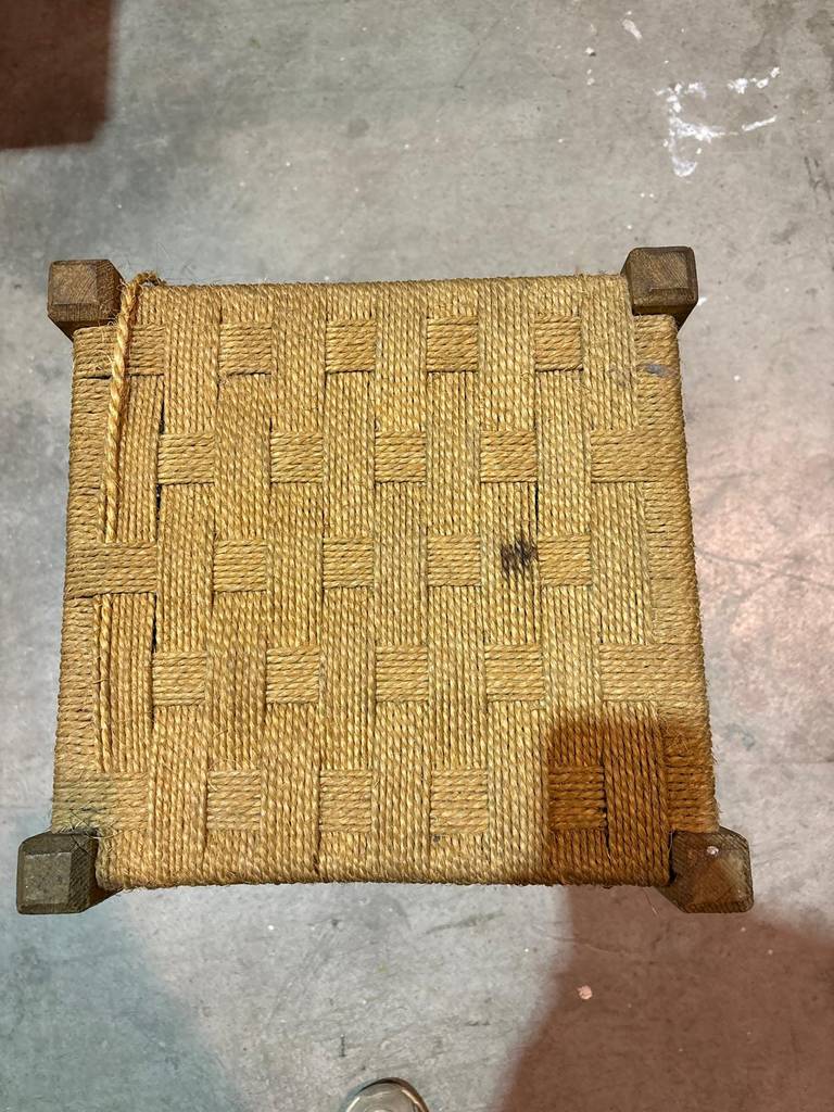 Taburete bajo con una estructura fabricada con madera de buena calidad y robusta así como un asiento en enea que lo hace resaltar. Es un taburete muy estable con cuatro patas unidas por finos listones de madera. Como podemos observar en las fotografías se encuentra con ligeros desperfectos, pero cumple su función correctamente.
