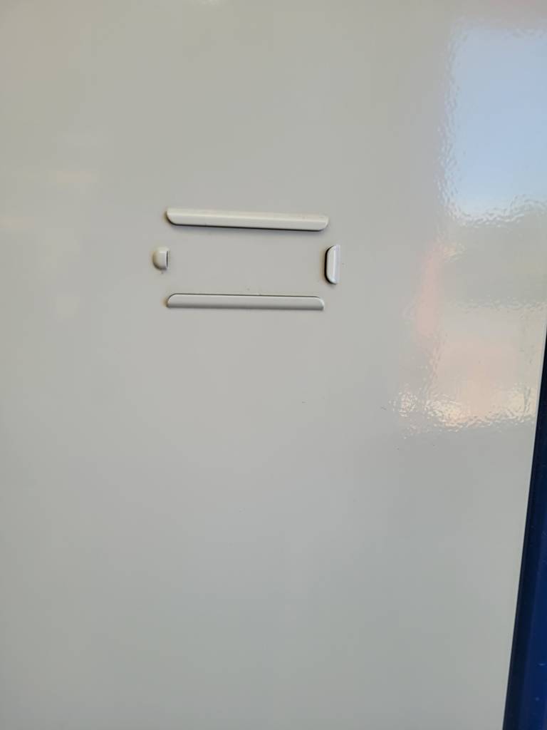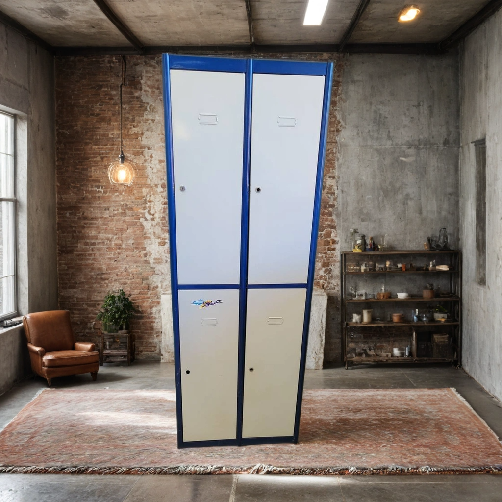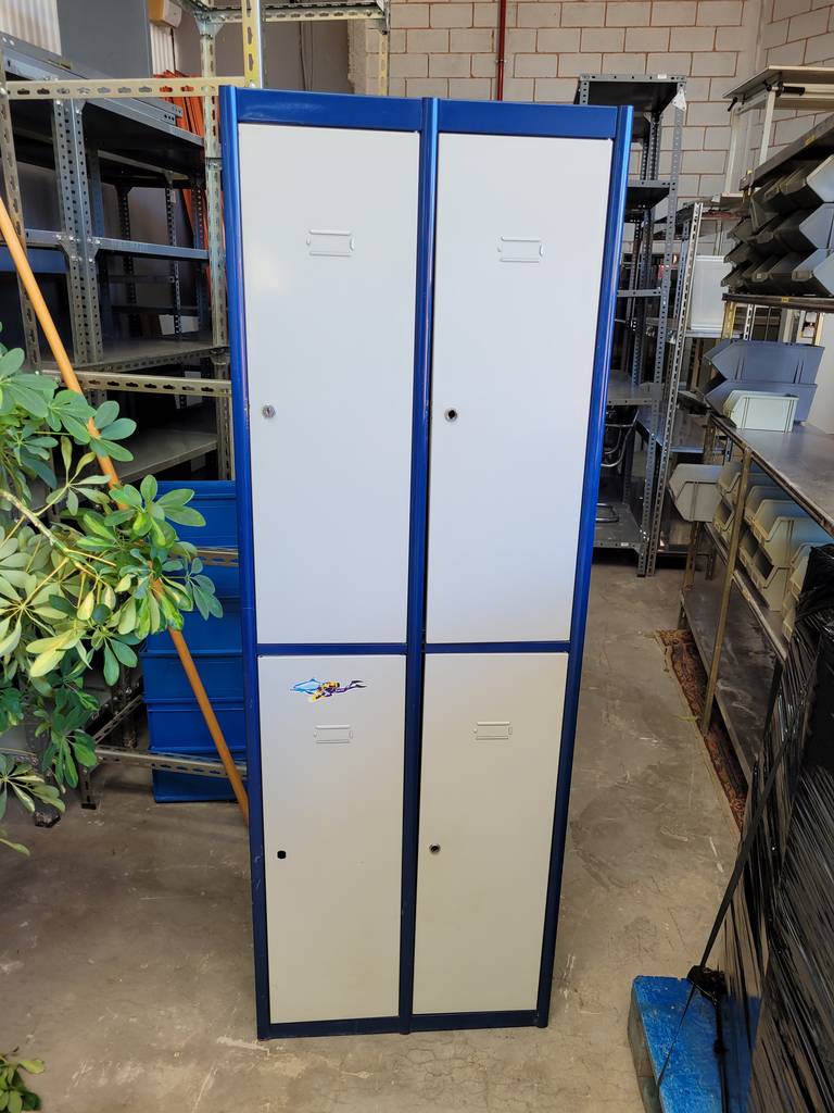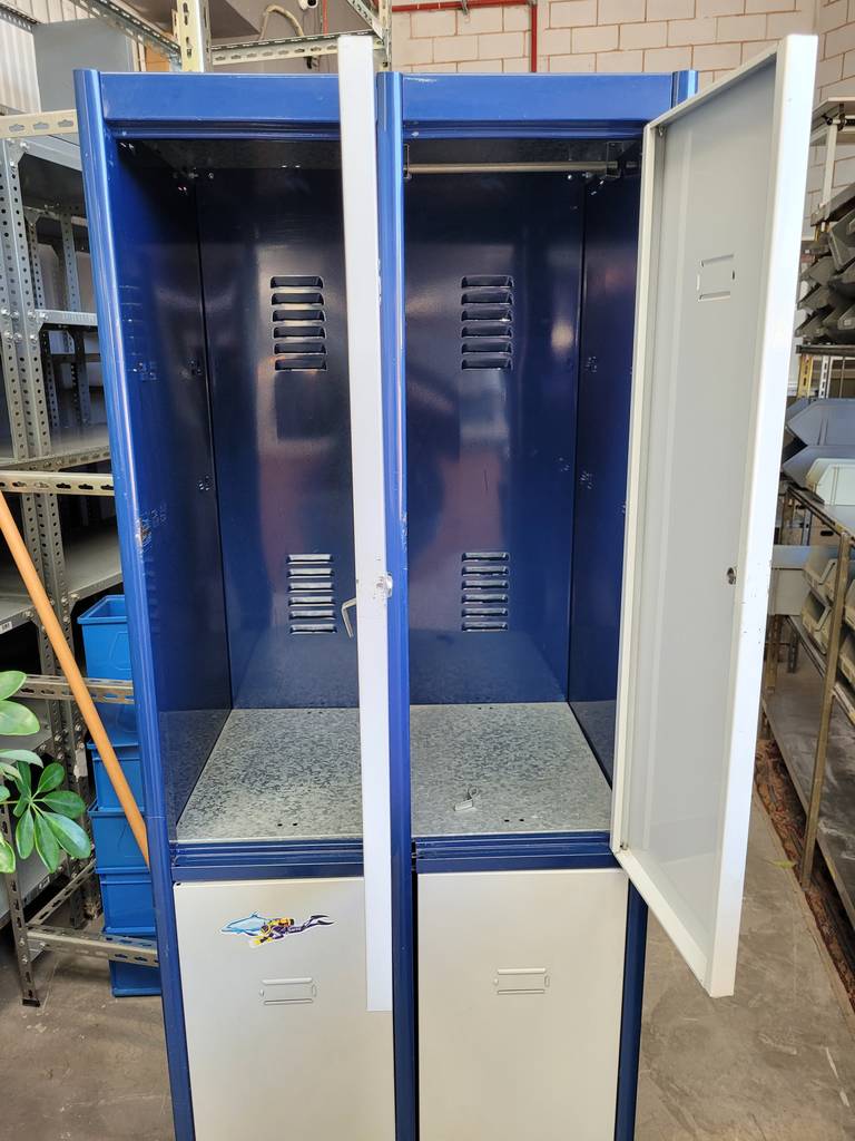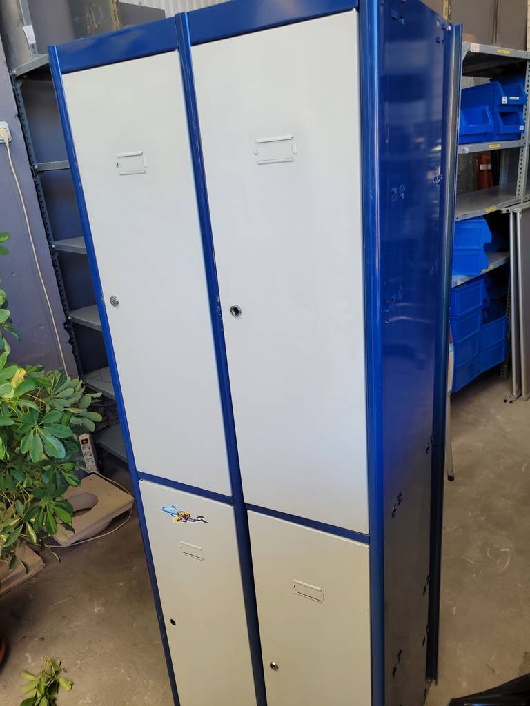 Taquillas metálicas de estatura alta de color gris claro y azul marino. Se trata de unas taquillas estrechas que tienen cuatro puertas y en su interior tienen espacio para guardar multitud de objetos. Son unas taquillas perfectas para colocarlas en un negocio para que los trabajadores guarden sus efectos personales. Como se puede observar en las fotografías se encuentran en buenas condiciones.