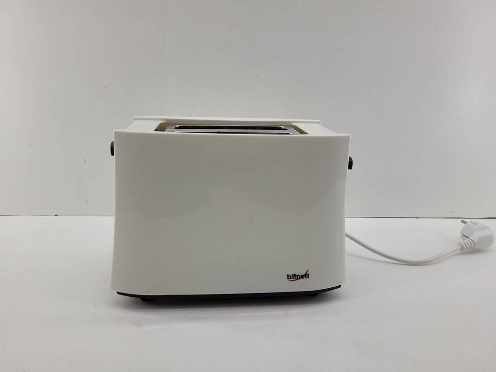 Tostadora de la reconocida marca de electrodomésticos Bifinett de color blanco. Se trata de una tostadora que tiene dos ranuras para colocar y preparar tostadas de pan de cualquier tipo. Es una tostadora perfecta para tenerla en la cocina de cualquier hogar. Como se puede observar en las fotografías se encuentra en buenas condiciones para ser utilizada.