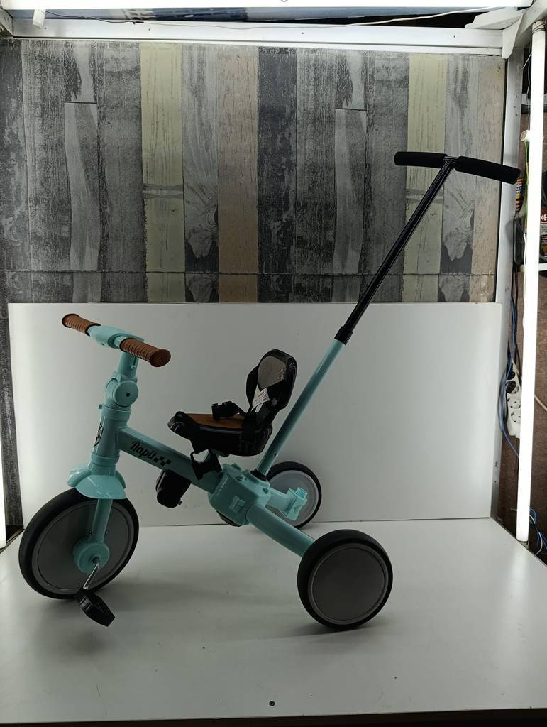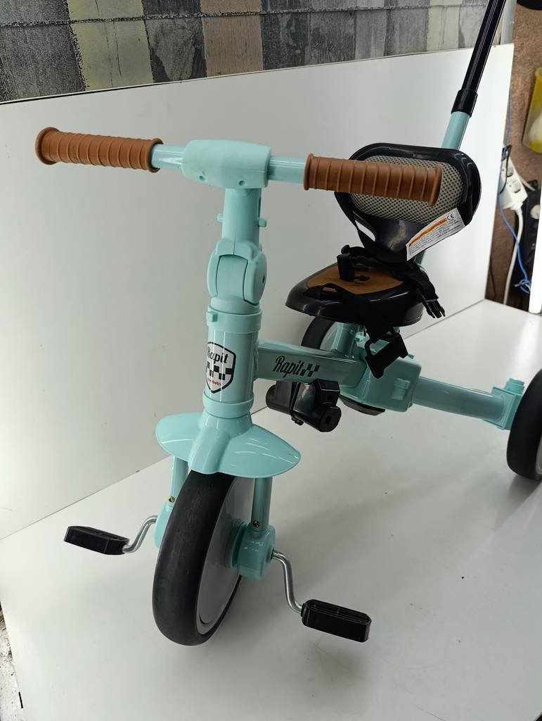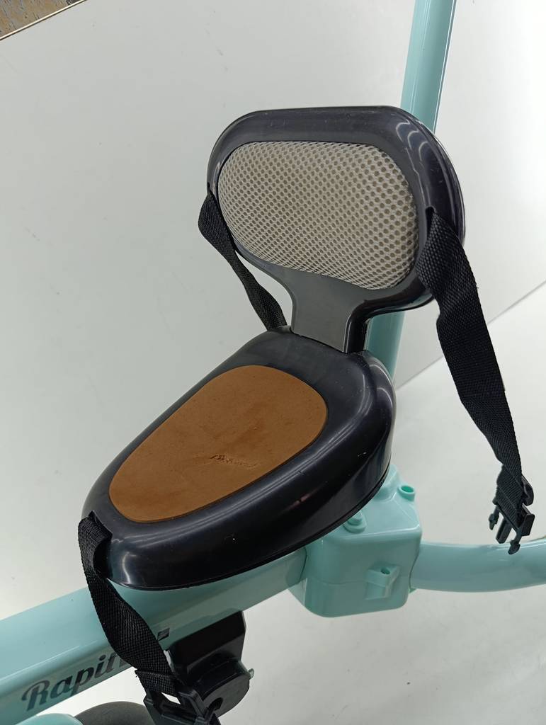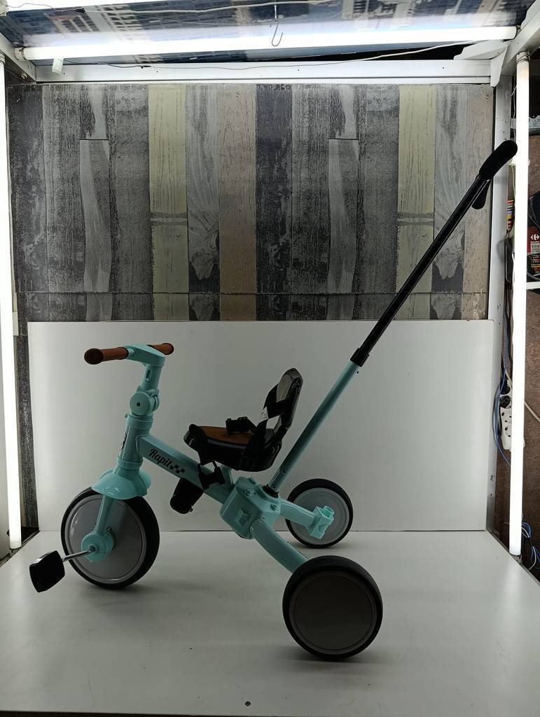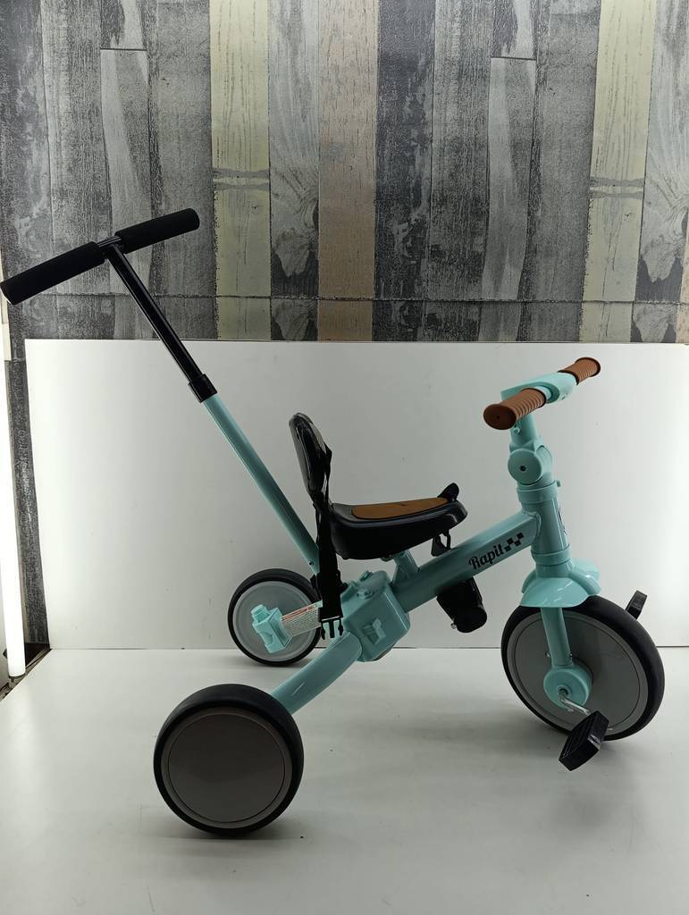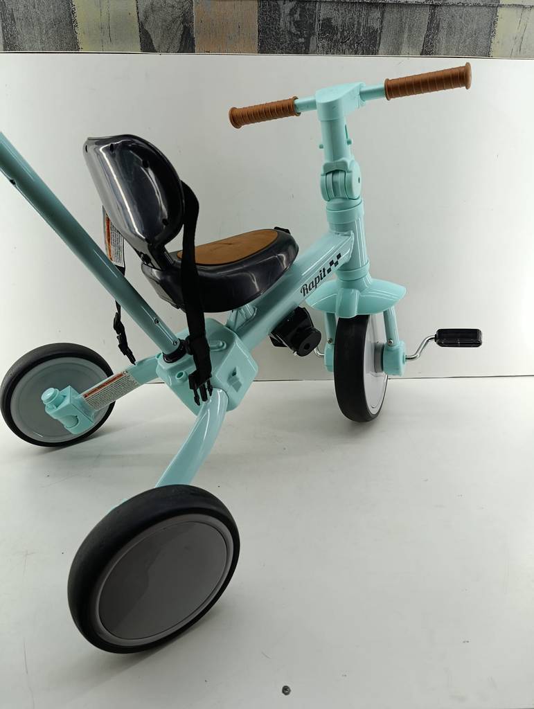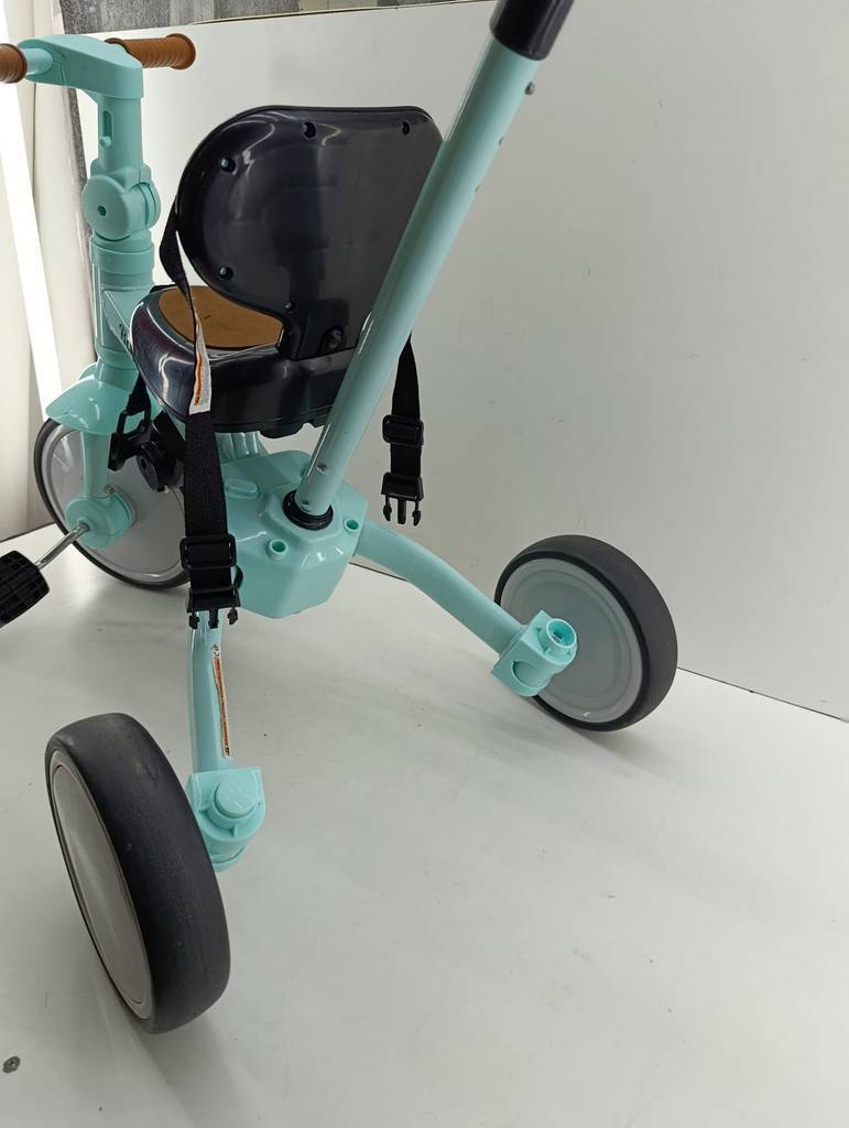 Triciclo evolutivo de color turquesa. Se trata de un triciclo evolutivo de color turquesa que cuenta con tres ruedas, un manillar, un cómodo asiento con respaldo y cinturón de seguridad y un palo con mango para poder llevarlo y conducirlo desde arriba y atrás. Es un triciclo ideal para un niño pequeño que aún no sepa ir en bicicleta. Como se puede observar en las fotografías se encuentra en buenas condiciones.