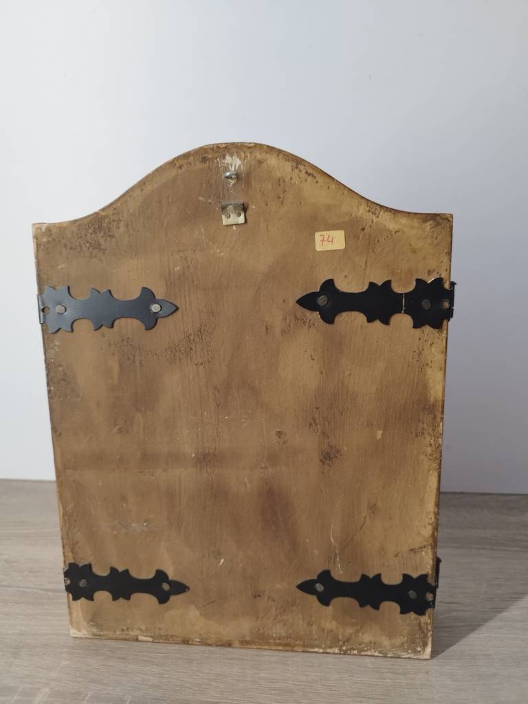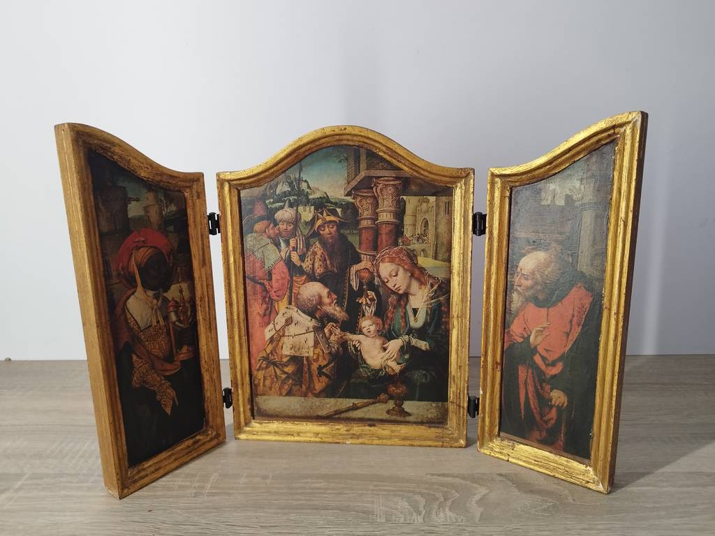 Tríptico de carácter religioso que ha sido pintado y en el que podemos observar la representación de la adoración de los reyes magos. Es una pieza ideal para amantes o coleccionistas de este tipo de productos religiosos y exponerlos en una colección privada o en un salón comedor. Está todo enmarcado con marcos de color dorado. Como podemos observar en las fotografías presenta desgaste.