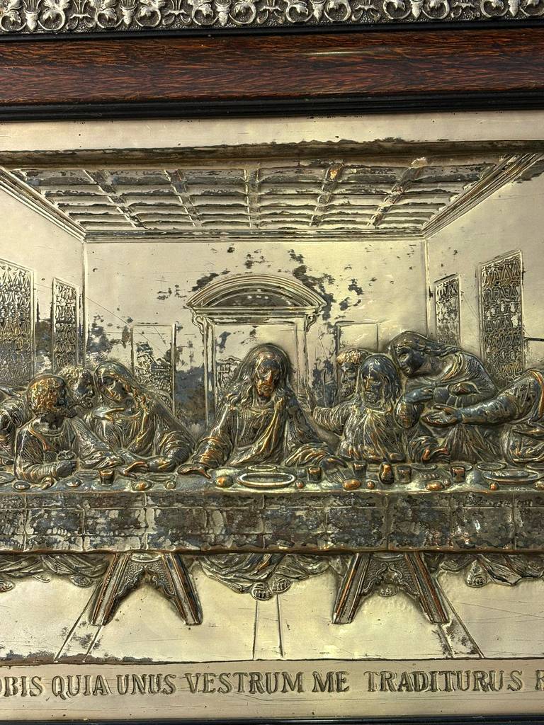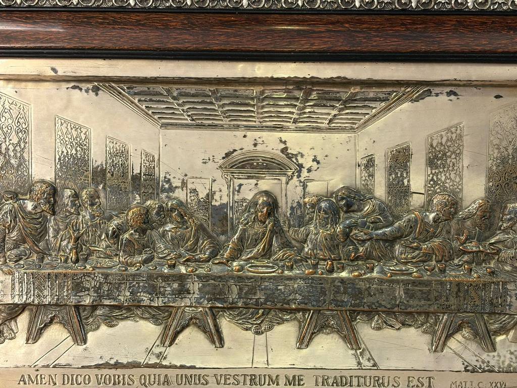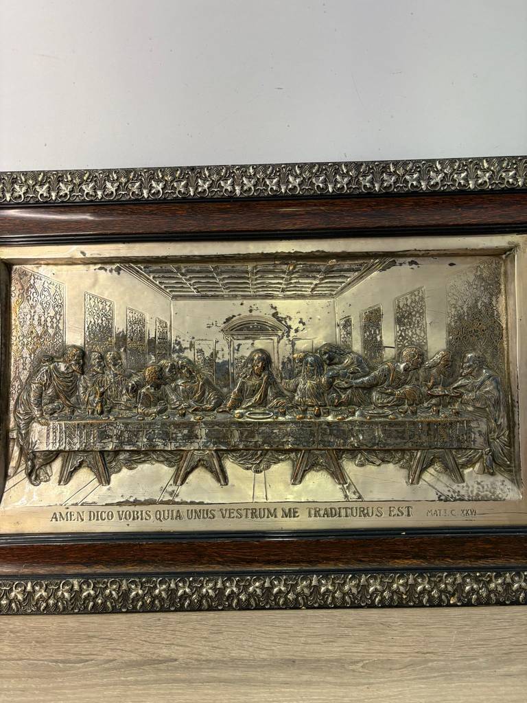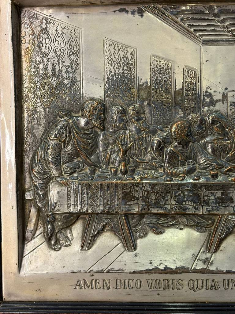 Cuadro de la última cena de Jesucristo que ha sido realizada con mucho detalle y precisión en metal plateado. Se trata de una pieza muy elegante que podemos colocar como pieza decorativa exponiéndose en un salón comedor o en un pasillo. Está enmarcada con un bonito marco doble, una plateado con relieves y otro de madera. Como podemos observar en las fotografías se encuentra en buenas condiciones.