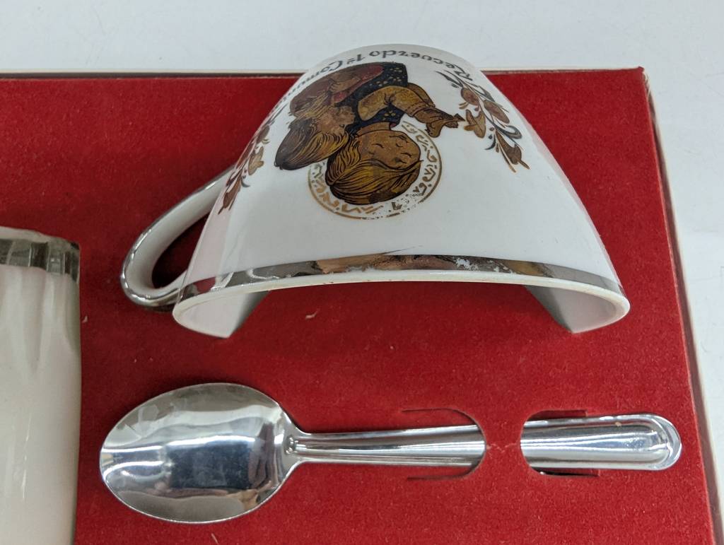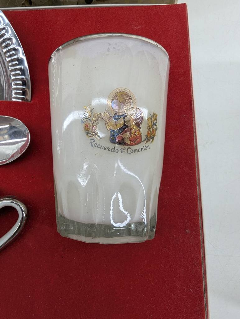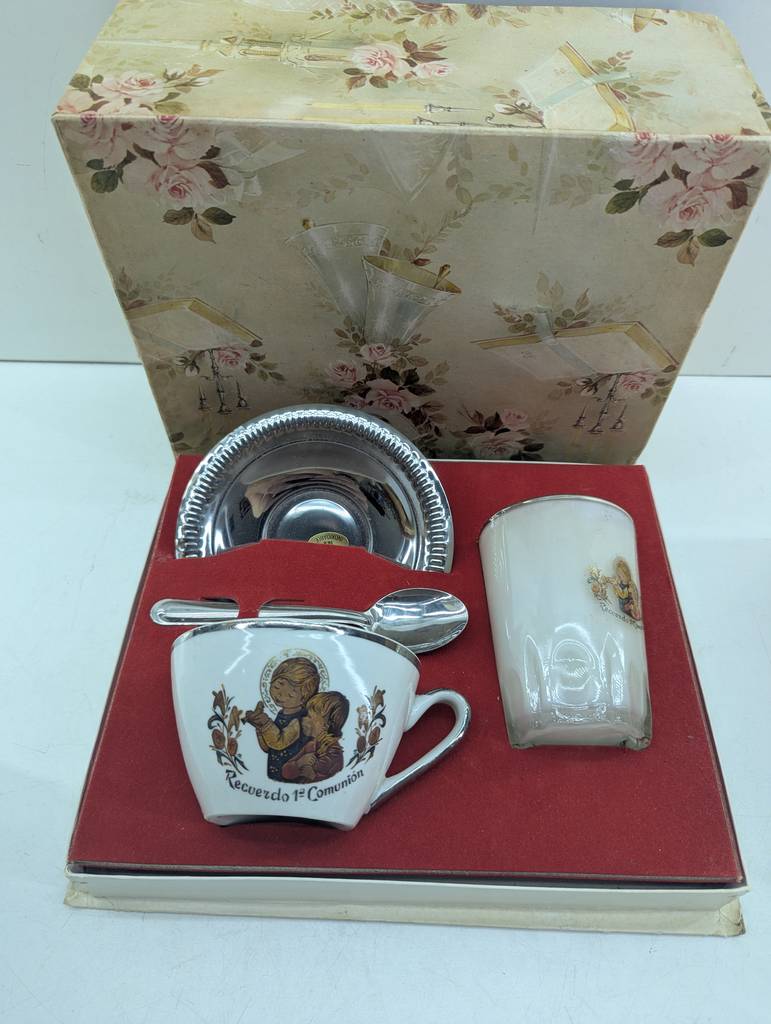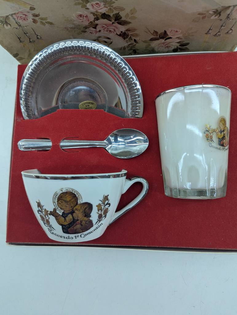 Vajilla de primera comunión que va colocada y guardada en su caja original. Se trata de una pequeña caja que lleva una taza con una cuchara, un pequeño plato plateado y un vaso de color blanco. Es un conjunto ideal para regalarlo a un niño o a una niña que vaya a realizar la primera comunión en breve. Como se puede observar en las fotografías se encuentra en buenas condiciones.
