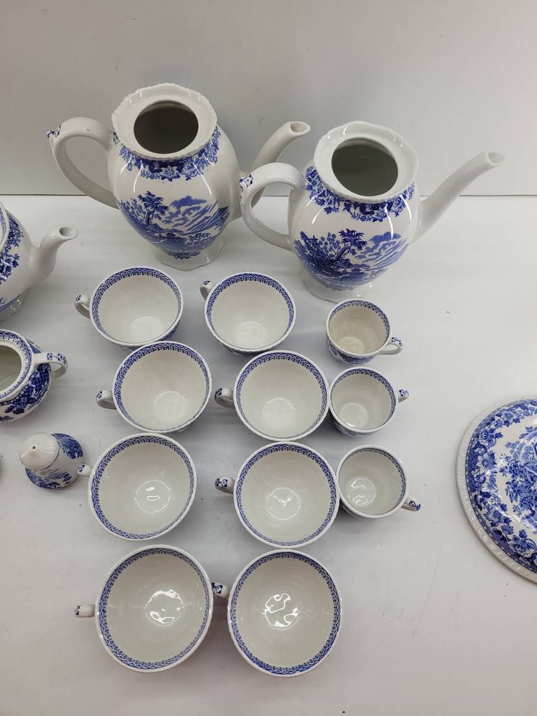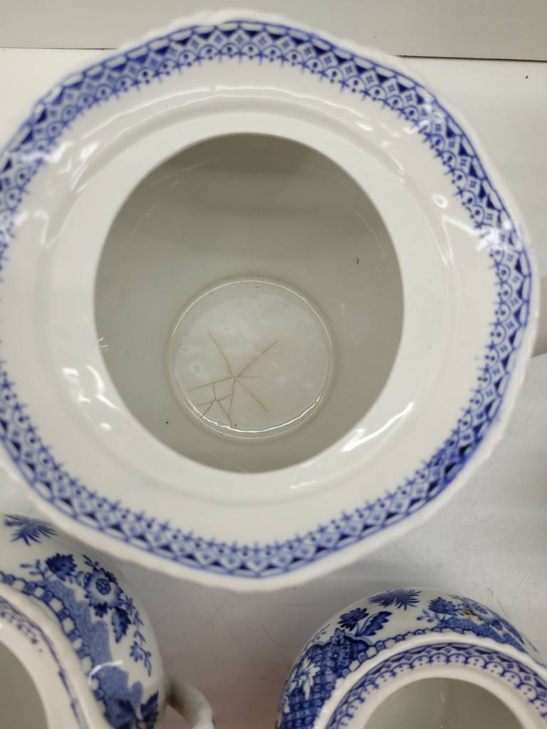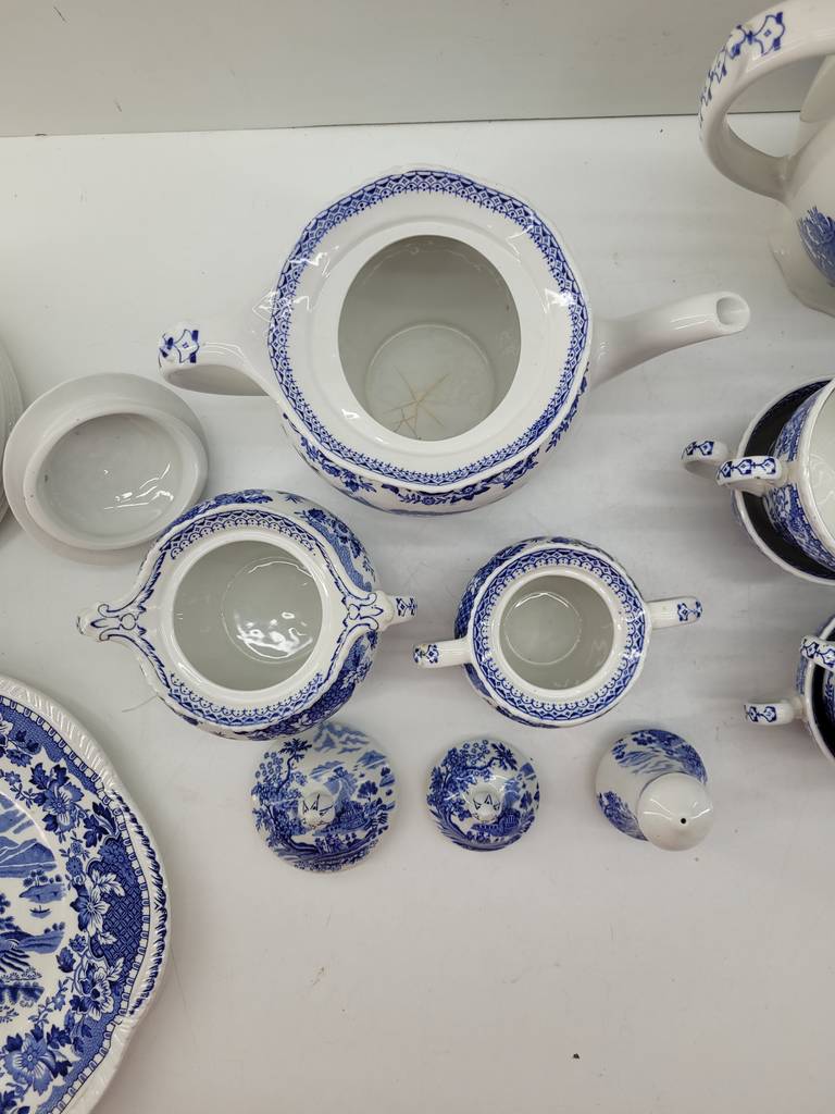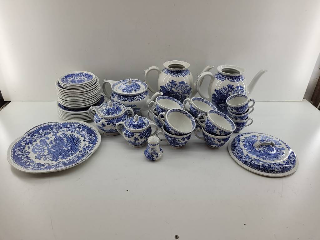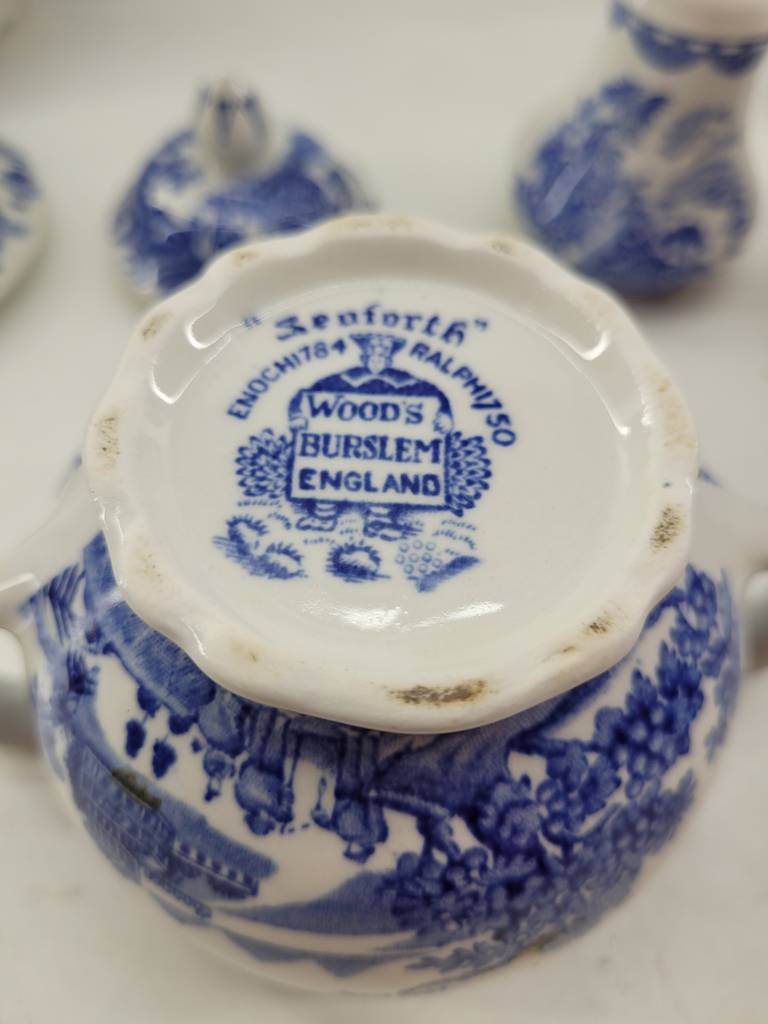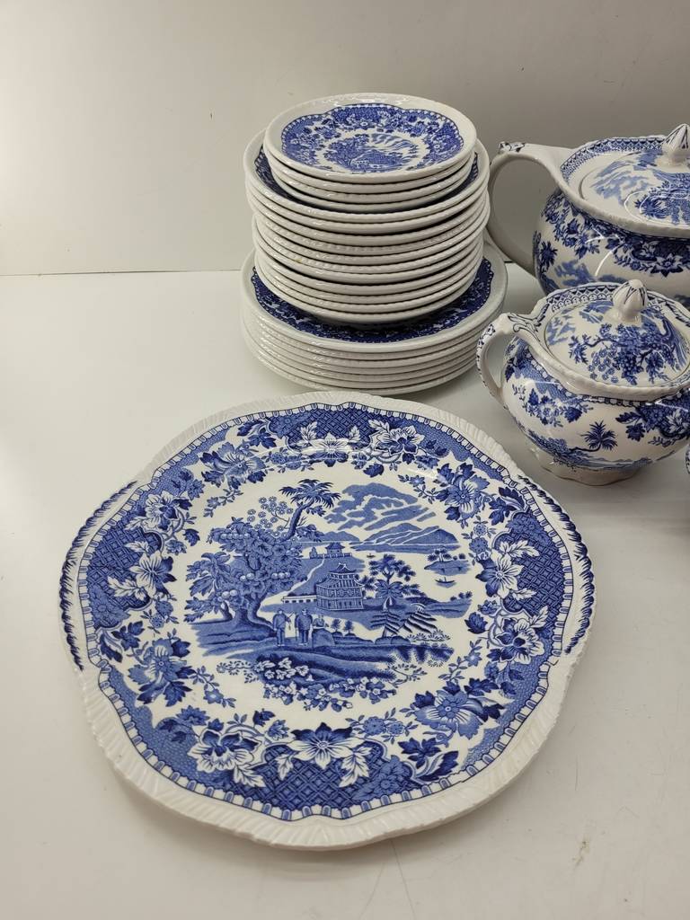 Vajilla completa Senforth fabricada en Inglaterra de color blanco con dibujos de un azul marino intenso. Se trata de una vajilla compuesta por platos de distintos tamaños, tazas de té o café, cuencos, jarras, teteras, azucarero, bandejas y un salero. Es una vajilla muy bonita ideal para tenerla en cualquier hogar para utilizarla en el día a día. Como se puede observar en las fotografías se encuentra en buenas condiciones.