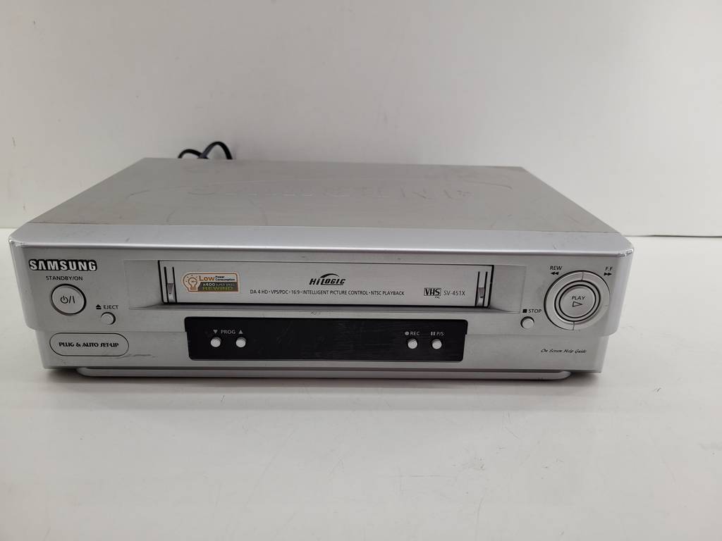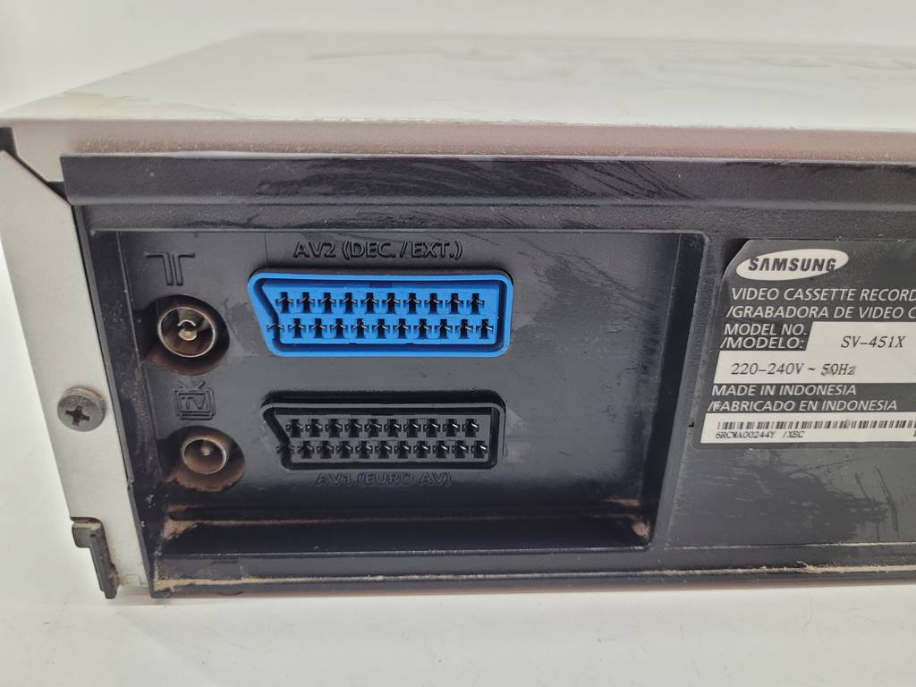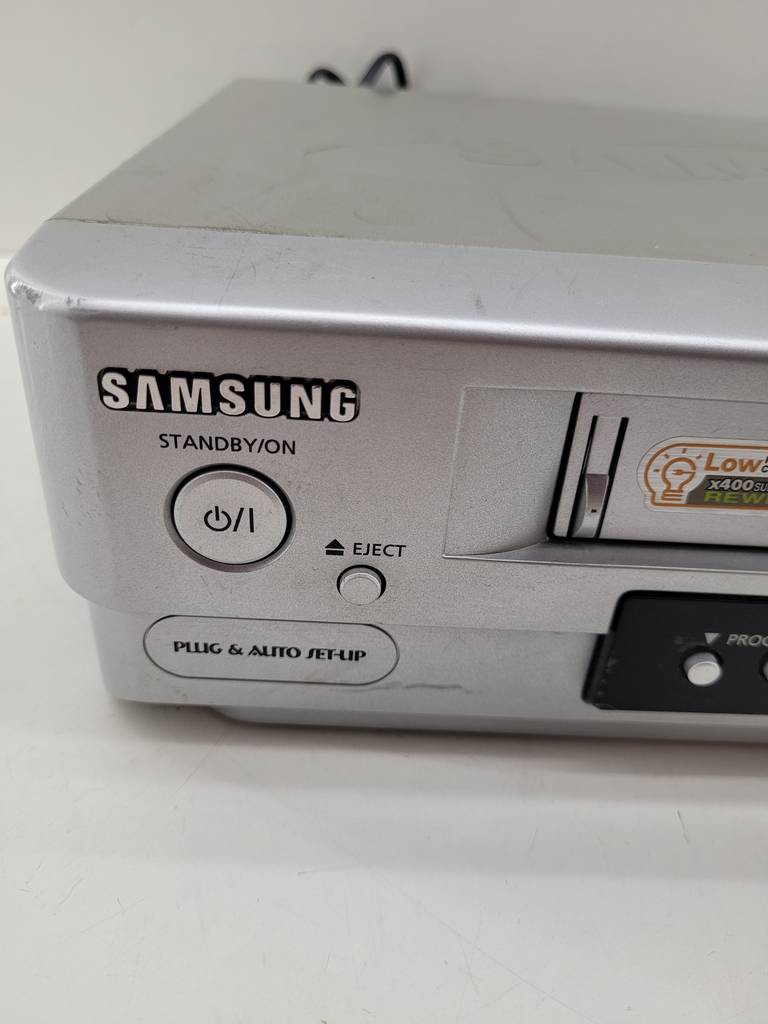 Reproductor y grabador de video de VHS de la marca Samsung. Se trata de un reproductor clásico ideal para coleccionistas que quieran reproducir películas en VHS con la máxima calidad. Incluye conexiones scart y de antena en la parte trasera. Como podemos observar en las fotografías presenta rasguños pero está listo para ser utilizado.