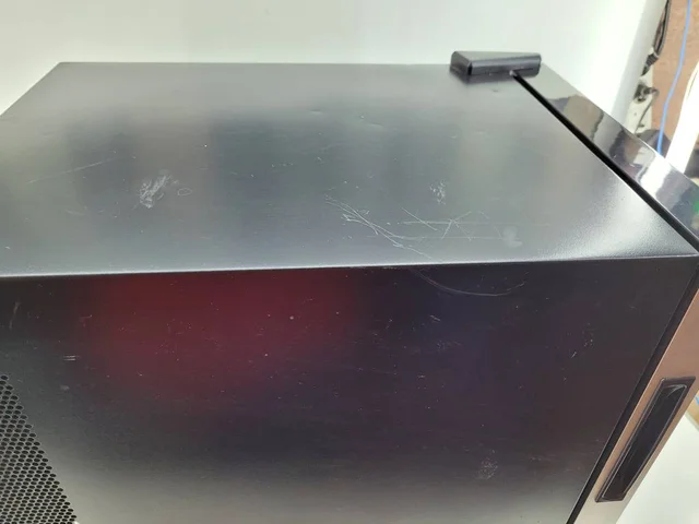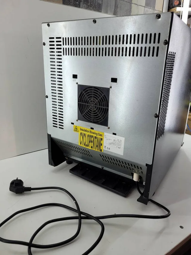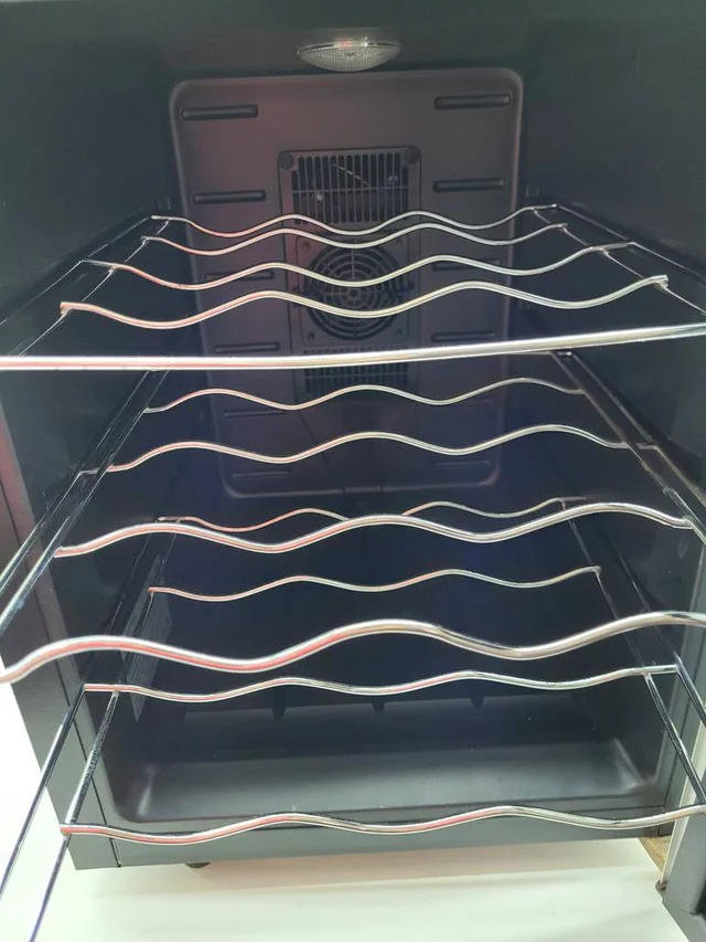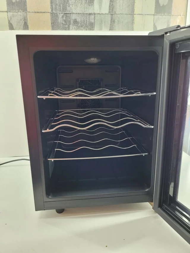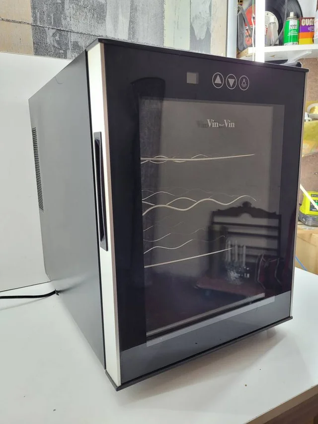 Vinoteca eléctrica de la marca Vin sur Vin de color negro. Se trata de una práctica vinoteca de tamaño mediano que resulta ideal para tenerla en la cocina del hogar o en el salón comedor para guardar en buen estado las botellas de vino. Como se puede observar en las fotografías la vinoteca tiene un ligero desperfecto en la parte superior que no afecta a su funcionalidad.