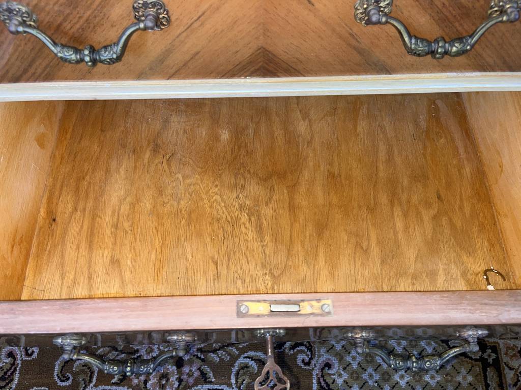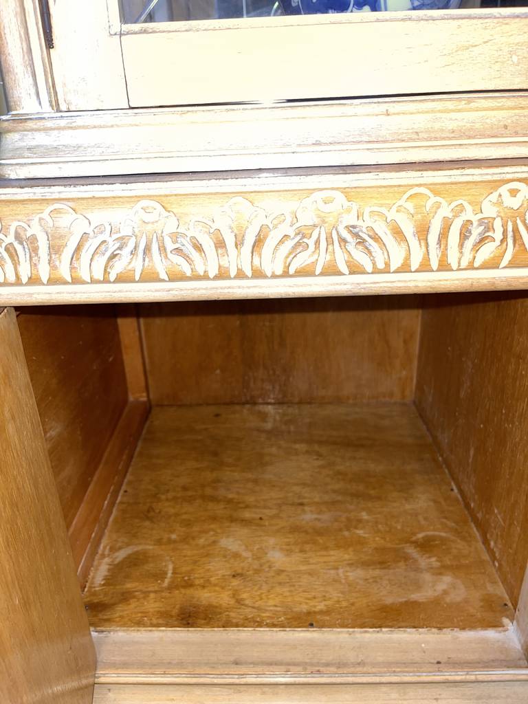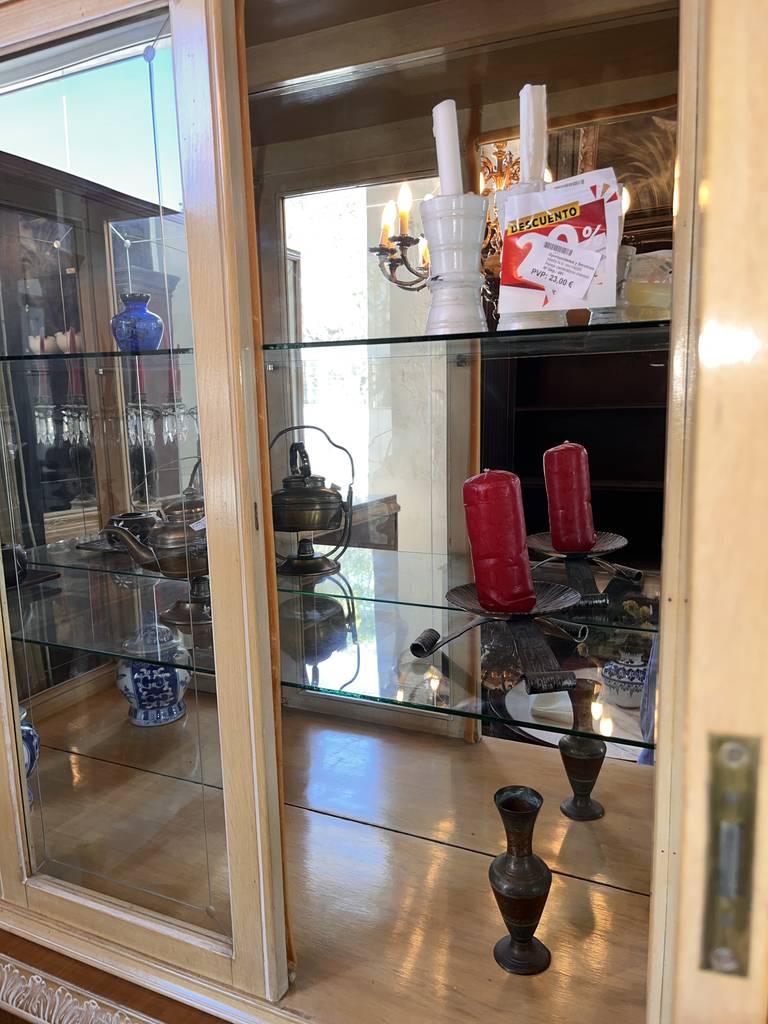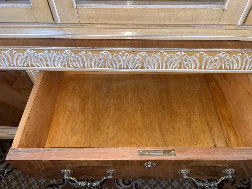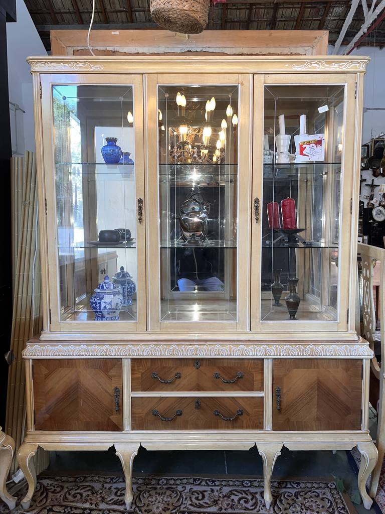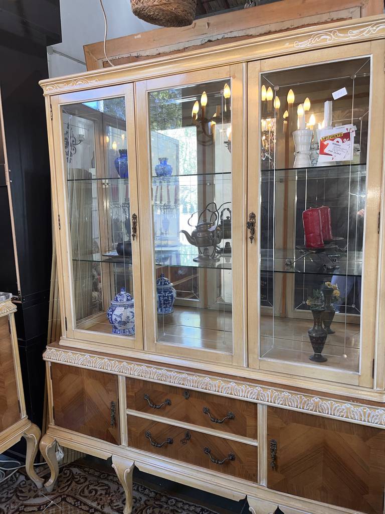 Vitrina clásica fabricada en madera de buena calidad de color marrón claro y crema. Se trata de una vitrina de gran tamaño que cuenta con una parte inferior en la que hay dos pequeñas puertas y dos cajones y una parte superior en la que hay tres puertas de cristal transparente. Es una vitrina perfecta para colocarla en un salón comedor de estilo clásico. Como se puede observar en las fotografías se encuentra en buenas condiciones.