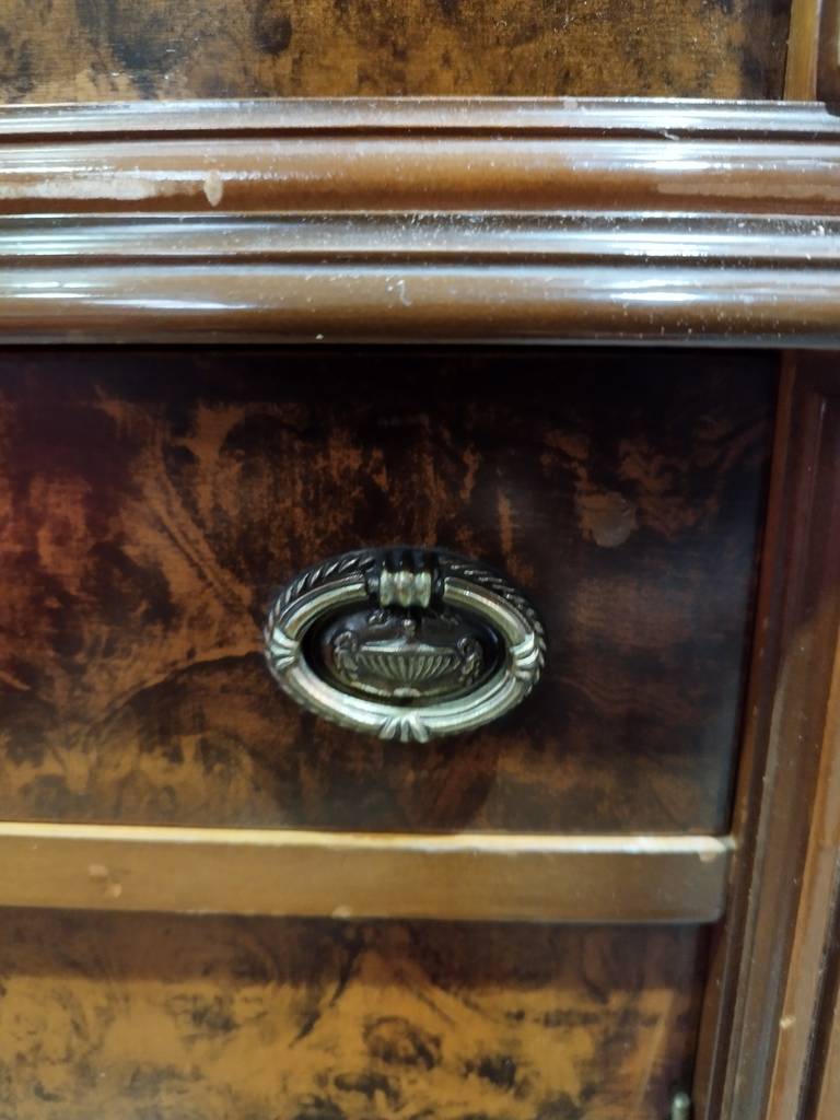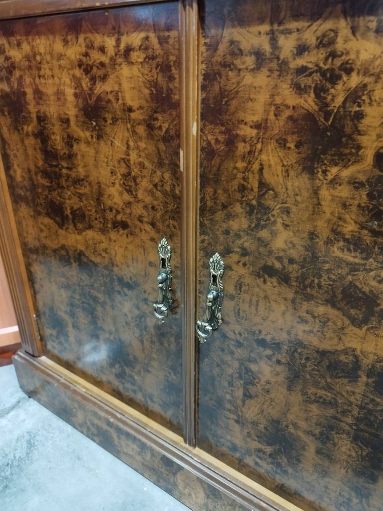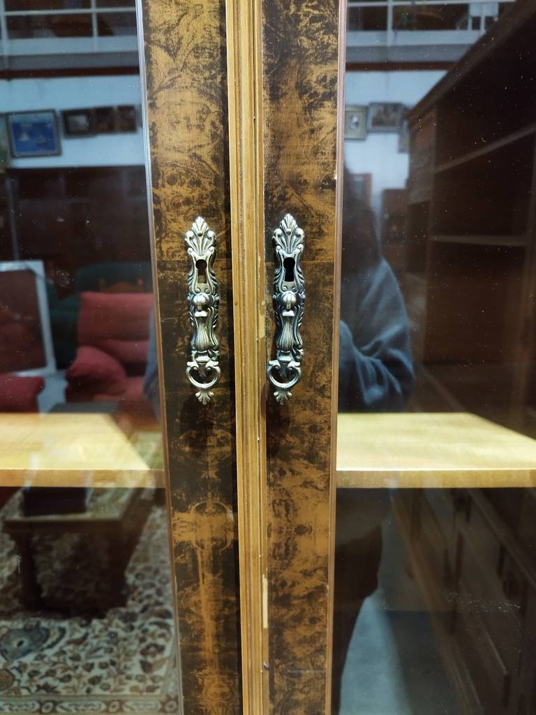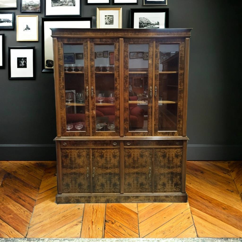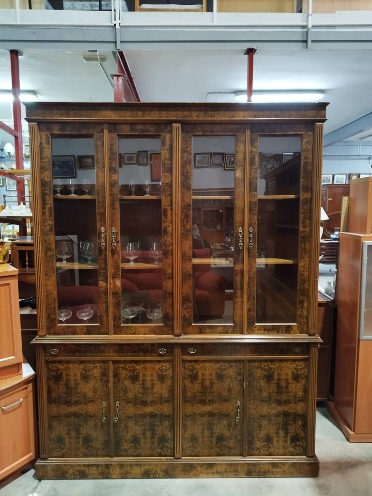 Vitrina de salón de estilo vintage de grandes dimensiones que ha sido fabricada con madera de buena calidad y robusta. Se compone de una parte superior con cuatro puertas a modo de vitrina de cristal transparente y con baldas interiores, así como en la parte inferior dos cajones y cuatro puertas. Es ideal para colocar en un salón comedor. Como podemos observar en las fotografías se encuentra en buenas condiciones.