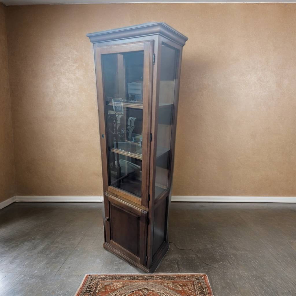 Vitrina alta y estrecha de estilo clásico que ha sido fabricada con madera de buena calidad y robusta. Se compone de una parte superior con una puerta y laterales de cristal transparente y una parte interior con tres espacios abiertos ideales para exponer figuras de colección. En la parte inferior incorpora un compartimento cerrado con puerta. Es ideal para un salón comedor.