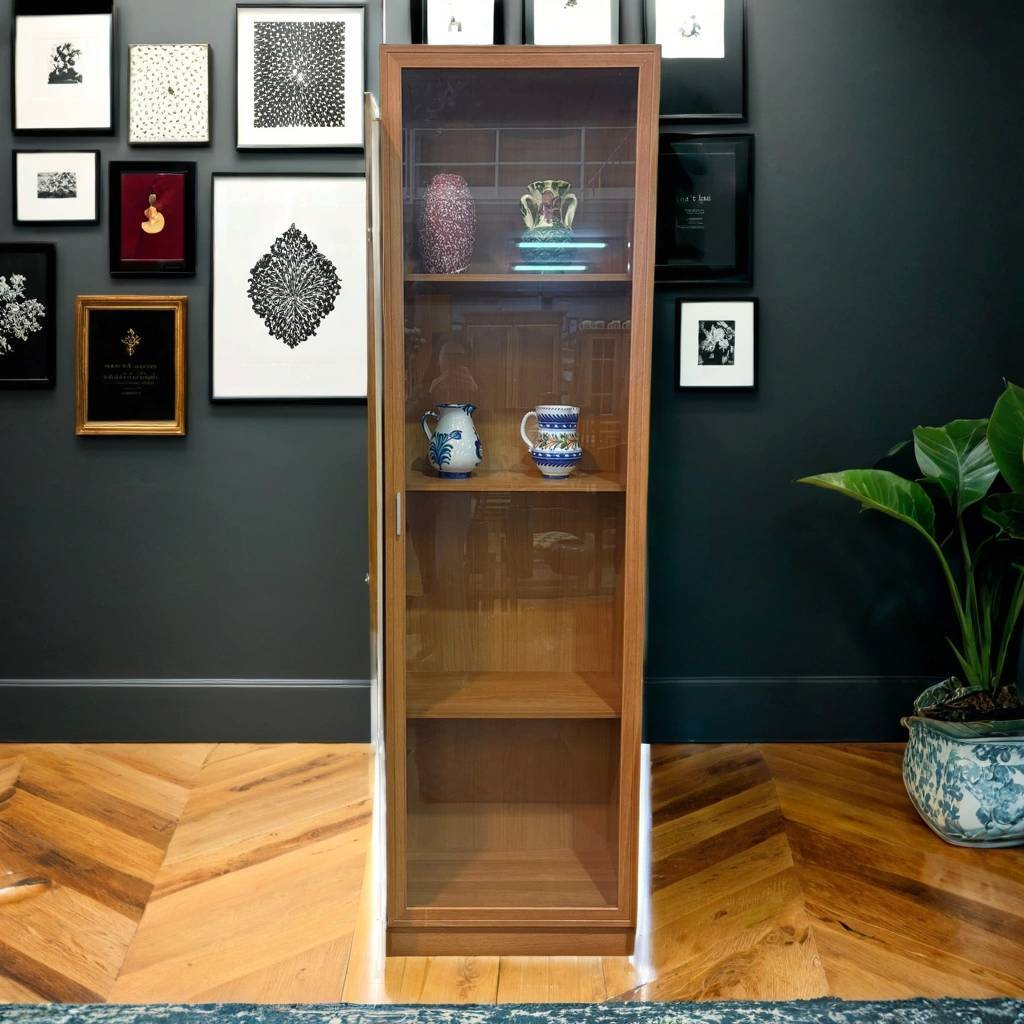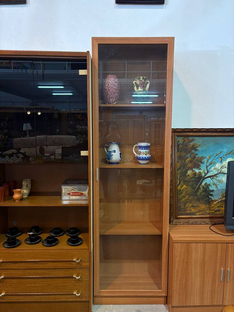 Vitrina estantería de estilo moderno que ha sido fabricada con madera de buena calidad y robusta. Se compone de una parte frontal con una puerta de cristal transparente a modo de vitrina y en su interior cuatro habitáculos abiertos amplios y grandes ideales para colocar libros o exponer figuras de colección. Como podemos observar en las fotografías se encuentra en buenas condiciones.