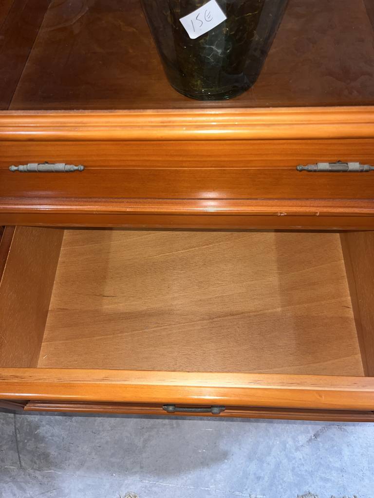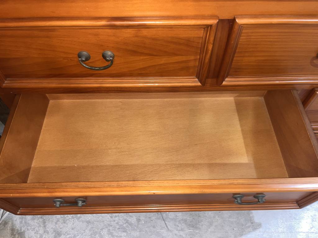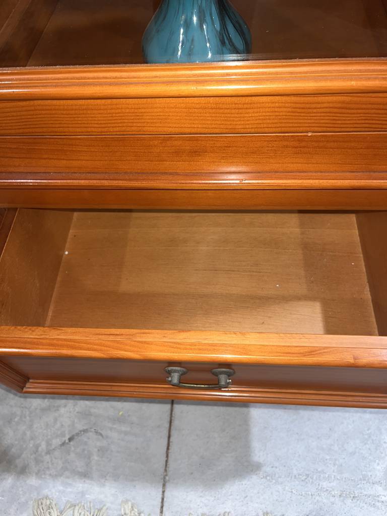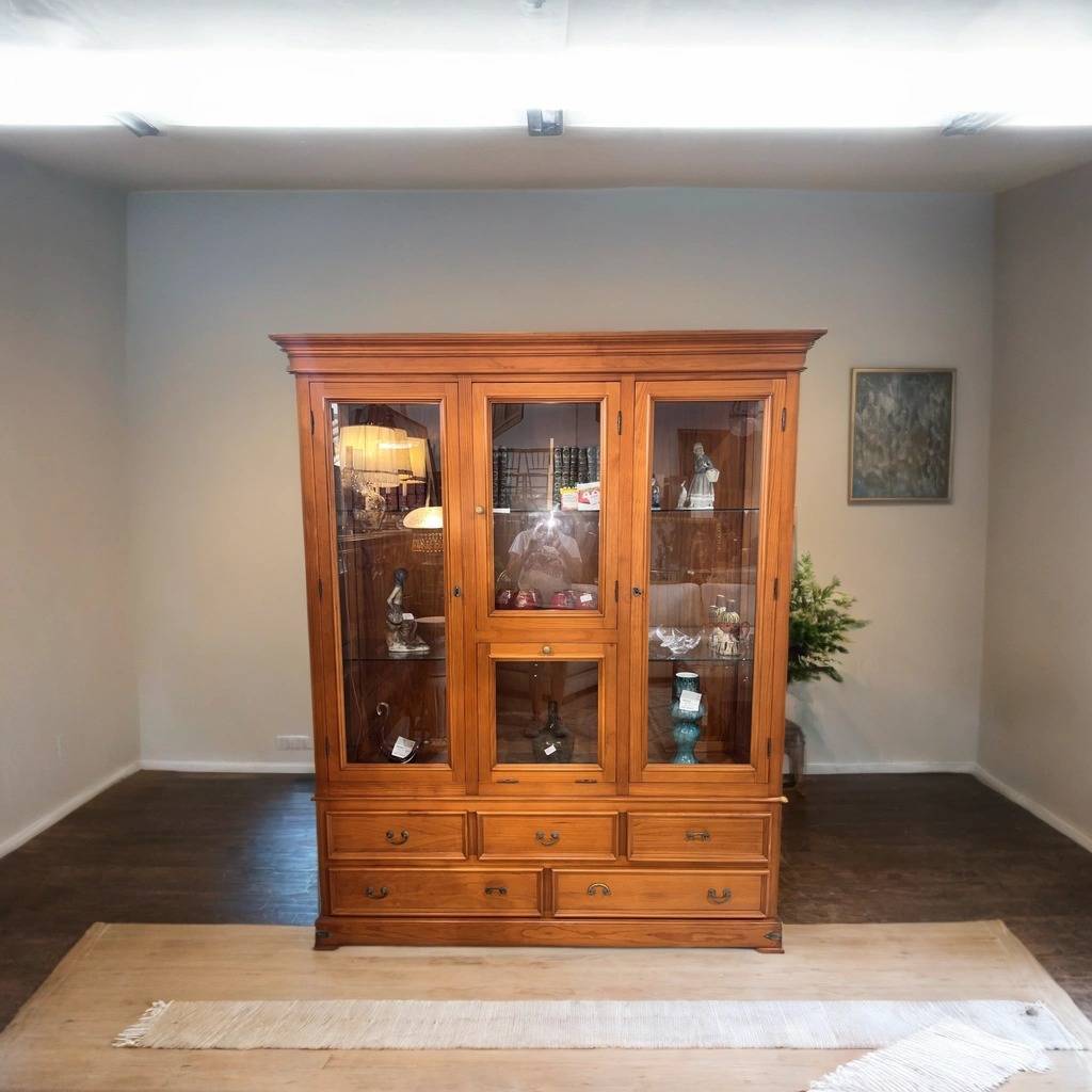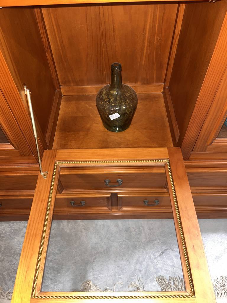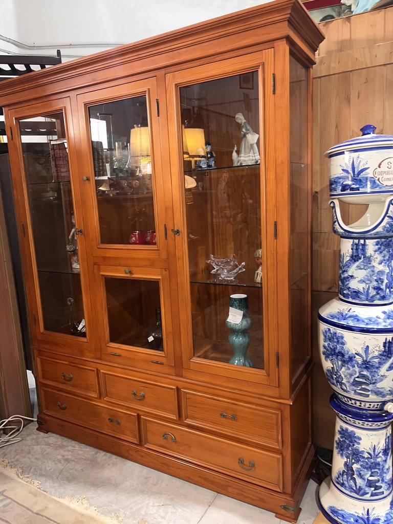 Mueble vitrina de estilo rústico fabricado en madera de buena calidad de color marrón claro. Se trata de una vitrina amplia de gran tamaño que cuenta con varias puertas acristaladas en las que se puede ver el interior y tiene cinco cajones con tiradores en forma de asa para abrirlos con mayor facilidad. Es una vitrina ideal para ponerla en una cocina. Como se puede observar en las fotografías se encuentra en buen estado.