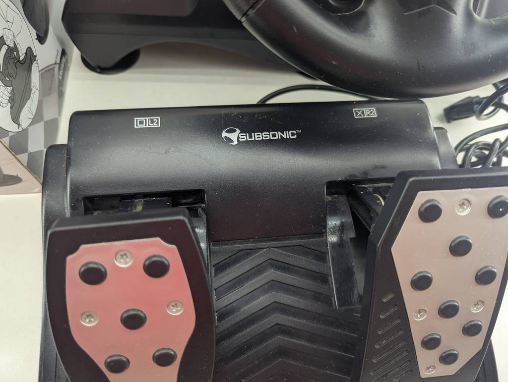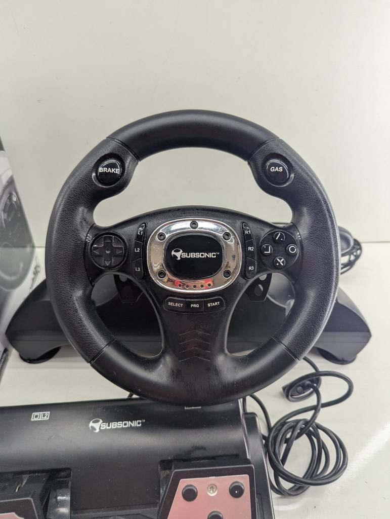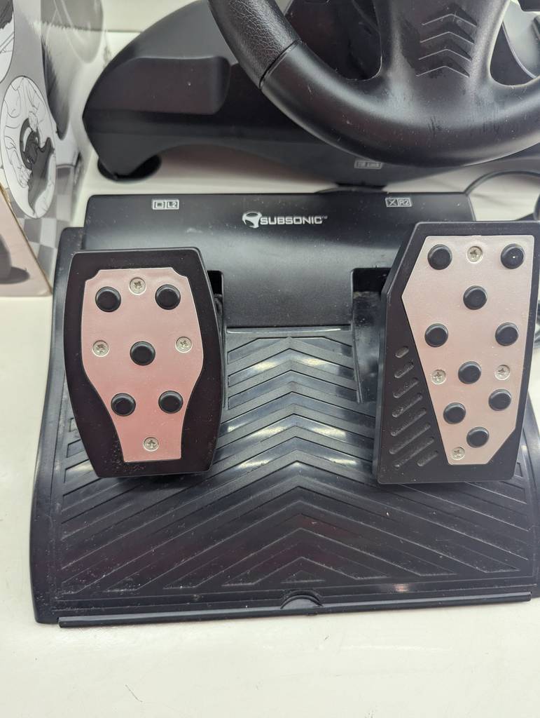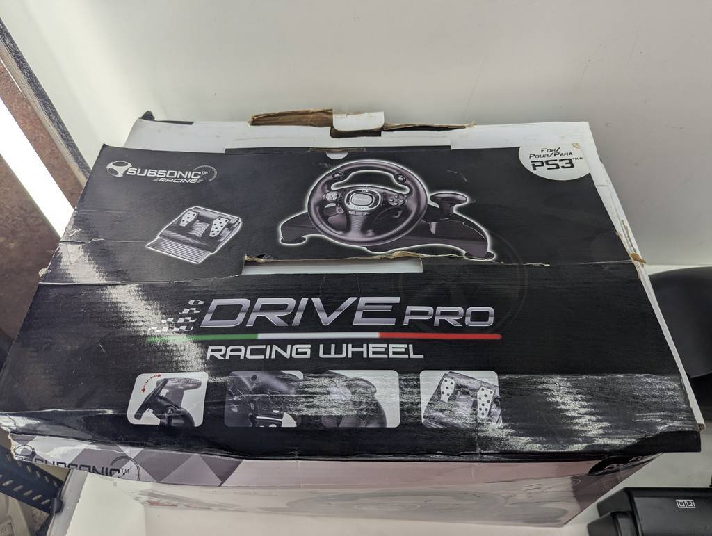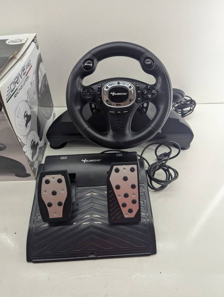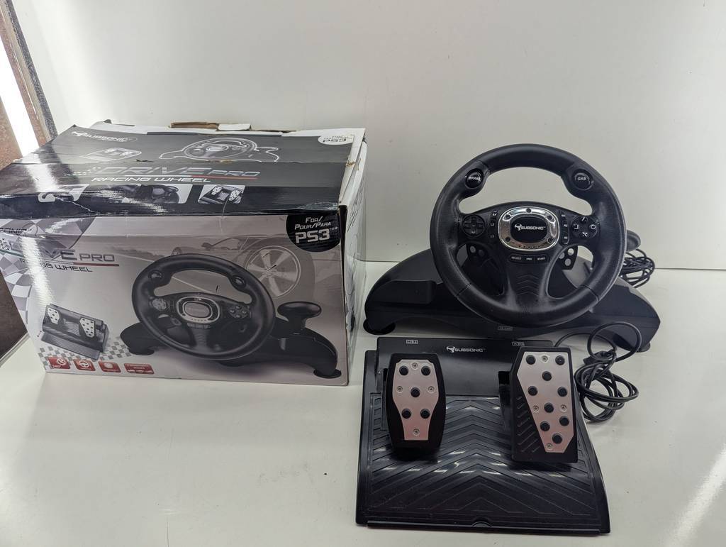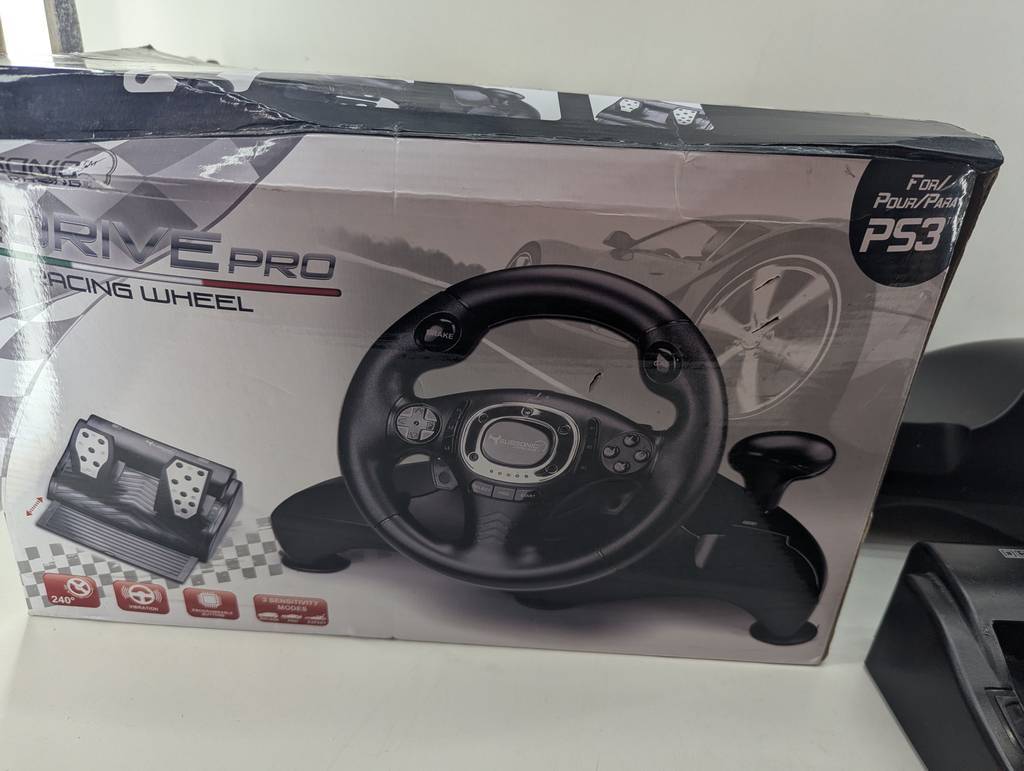 Volante para jugar a la videoconsola Play Station tres modelo Superdrive Pro. Se trata de un volante que va acompañado de dos pedales y sirve para conectarlo a una videoconsola y jugar a juegos de conducir distintos tipos de coches. Es un complemento ideal para tenerlo en el hogar y aumentar la diversión. Como se puede observar en las fotografías va en su caja original y se encuentra en buenas condiciones.